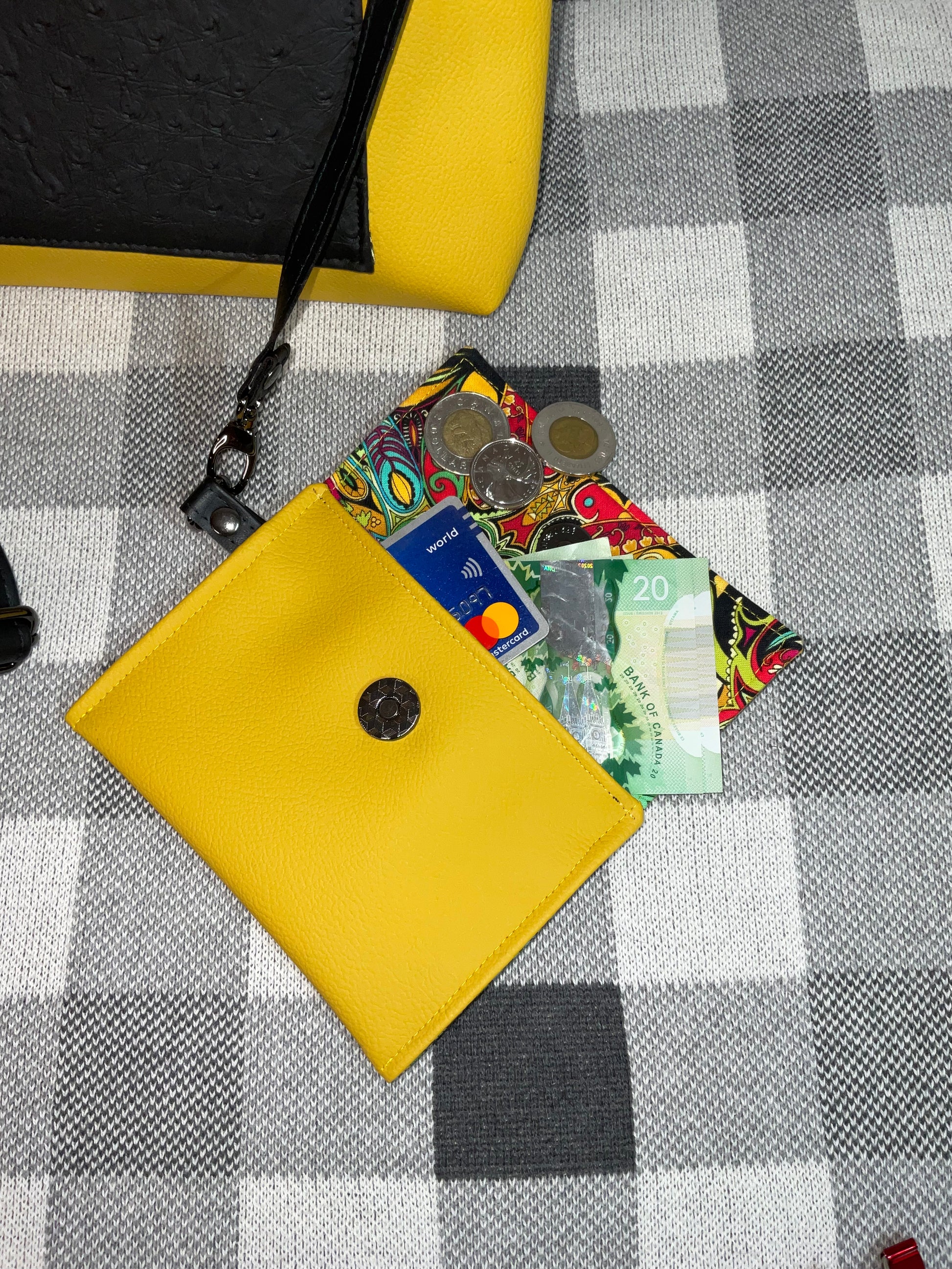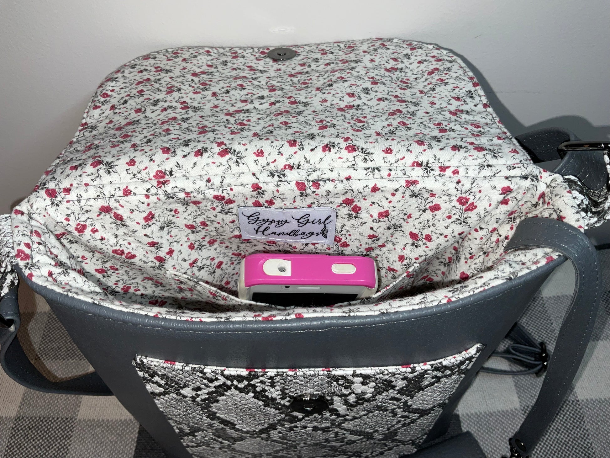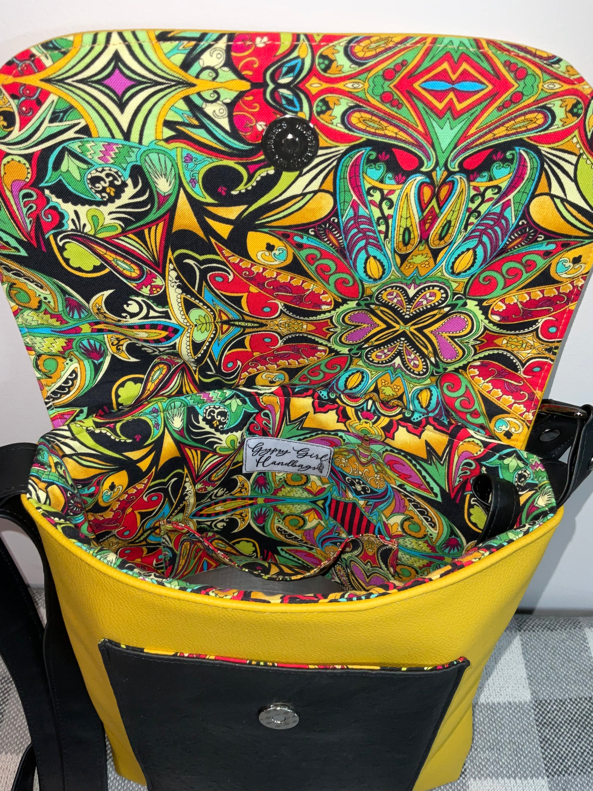 The inside is fully lined in 100% designer cotton and features a slip pocket and a zippered pocket to keep valuables secure. The interior zipper boasts a little bling with a zipper pull labeled 'handmade'.